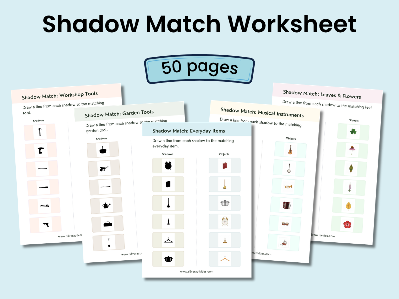 Shadow Match is a simple yet engaging activity designed to gently stimulate the brain through visual matching. Research in cognitive therapy and dementia care shows that matching and object-recognition tasks help improve attention, memory, and visual processing skills, while providing low-stress mental stimulation. This printable set includes 50 worksheets across 5 different themes (10 sheets per theme), with each page featuring 6 objects and their matching shadows – perfect for keeping seniors focused, relaxed, and meaningfully engaged.